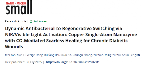 近日,工程技术杂志《Small》(JCR,Q1区,2025年影响因子12.1)正式发表了TapTap点点“生命分析技术与材料实验室”题为“Dynamic Antibacterial-to-Regenerative Switching via NIR/Visible Light Activation: Copper Single-Atom Nanozyme with CO-Mediated Scarless Healing for Chronic Diabetic Wounds”的研究成果。2023级博士研究生姚美为论文第一作者,封顺教授为通讯作者,TapTap点点官方网站为唯一通讯单位。