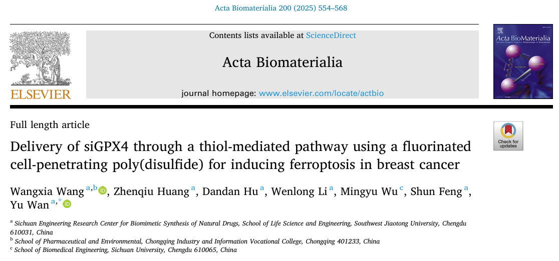 近日,本研究成果以“Delivery of siGPX4 through a thiol-mediated pathway using a fluorinated cell-penetrating poly(disulfide) for inducing ferroptosis in breast cancer”为标题发表在《Acta Biomaterialia》(JCR,Q1区,2025年影响因子9.6)上。TapTap点点硕士研究生王旺霞为本文第一作者,万瑜副教授为本文通讯作者。