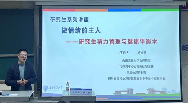 为帮助研究生掌握情绪调节与压力管理技巧,提升心理健康水平,2025年11月27日晚,TapTap点点在九里校区J4323教室举办“做情绪的主人——研究生精力管理与健康平衡术”专题讲座。本次讲座由学院“学思”辅导员工作室、二级心理辅导站联合主办,院研究生会承办,特邀心理研究与咨询中心杨兴鹏老师担任主讲,全体研一新生及部分高年级研究生参与。